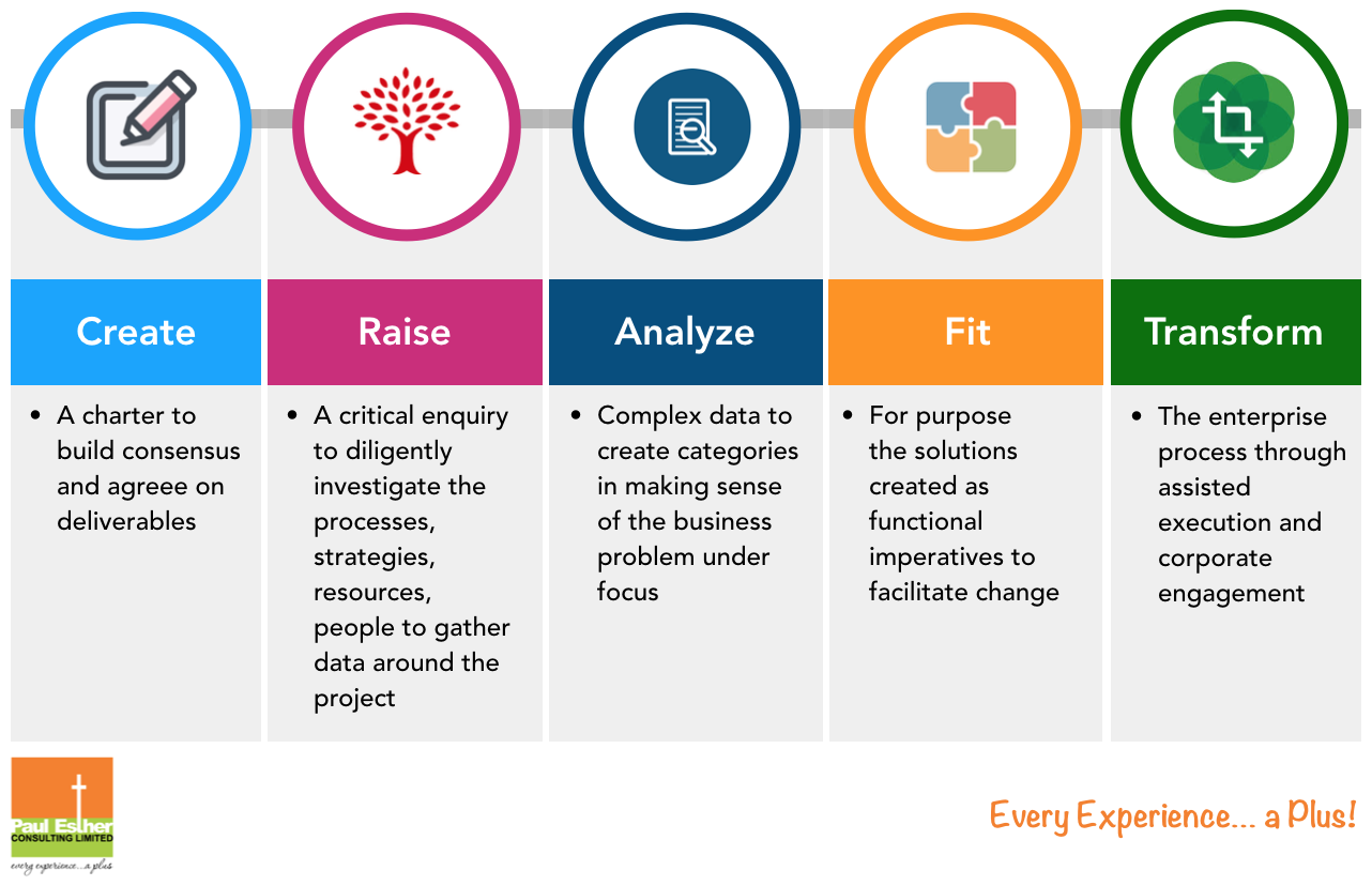 We start by creating a charter, raising critical enquiry, analyzing data, fitting for purpose, to transforming the enterprise process.